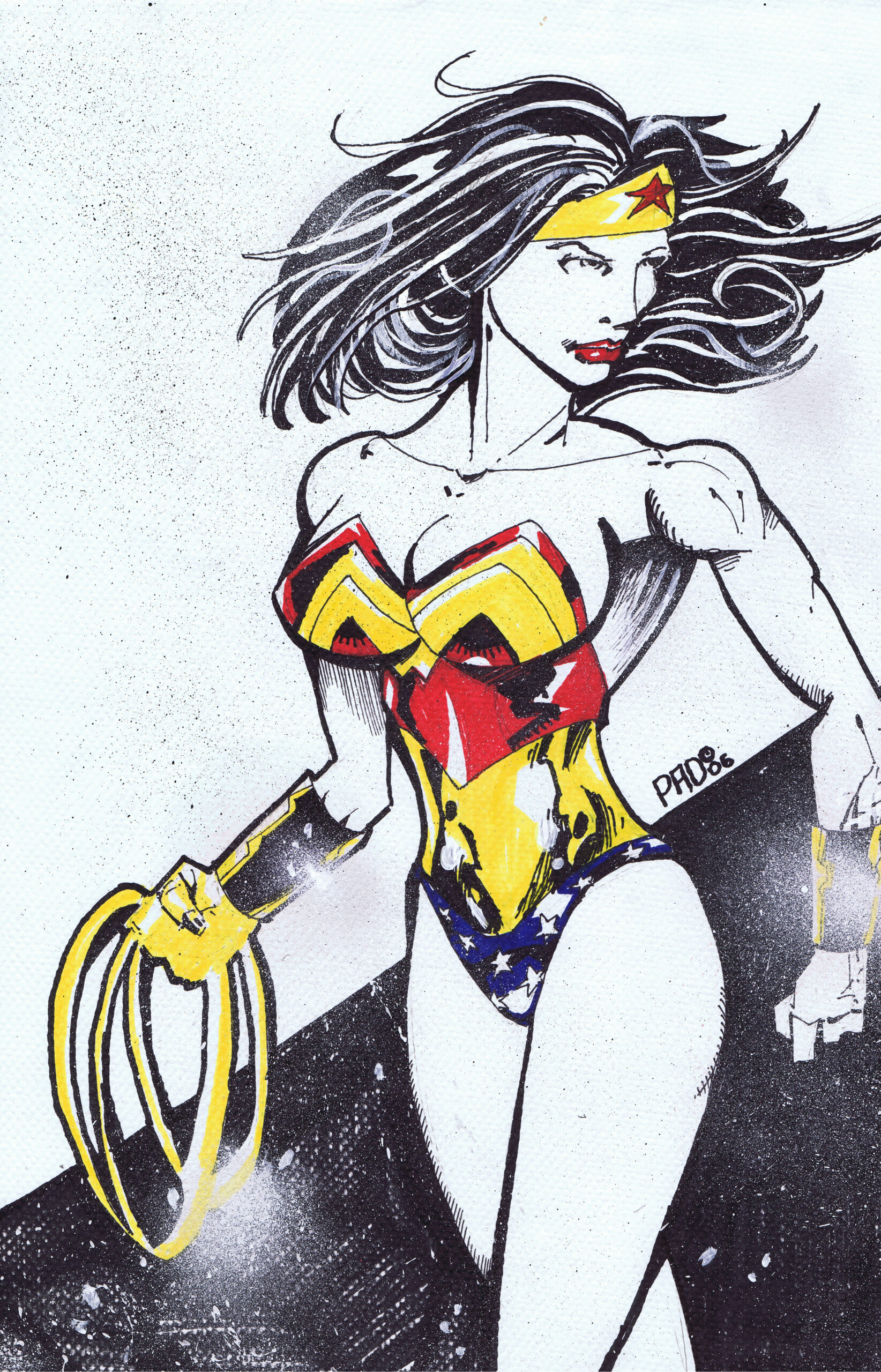 While Nagel wasn’t new to the comic book world—his bold, Art Deco-influenced aesthetic (with its clean lines, flat colors, and striking portraits of powerful women) had already influenced many illustrators by the 80s and beyond—this was my first time applying his distinctive style directly to Wonder Woman. I set out to challenge myself, focusing especially on the dynamic application of white splattered acrylic paint to simulate the shimmering, almost electric power radiating from her iconic gauntlets and Lasso of Truth.
